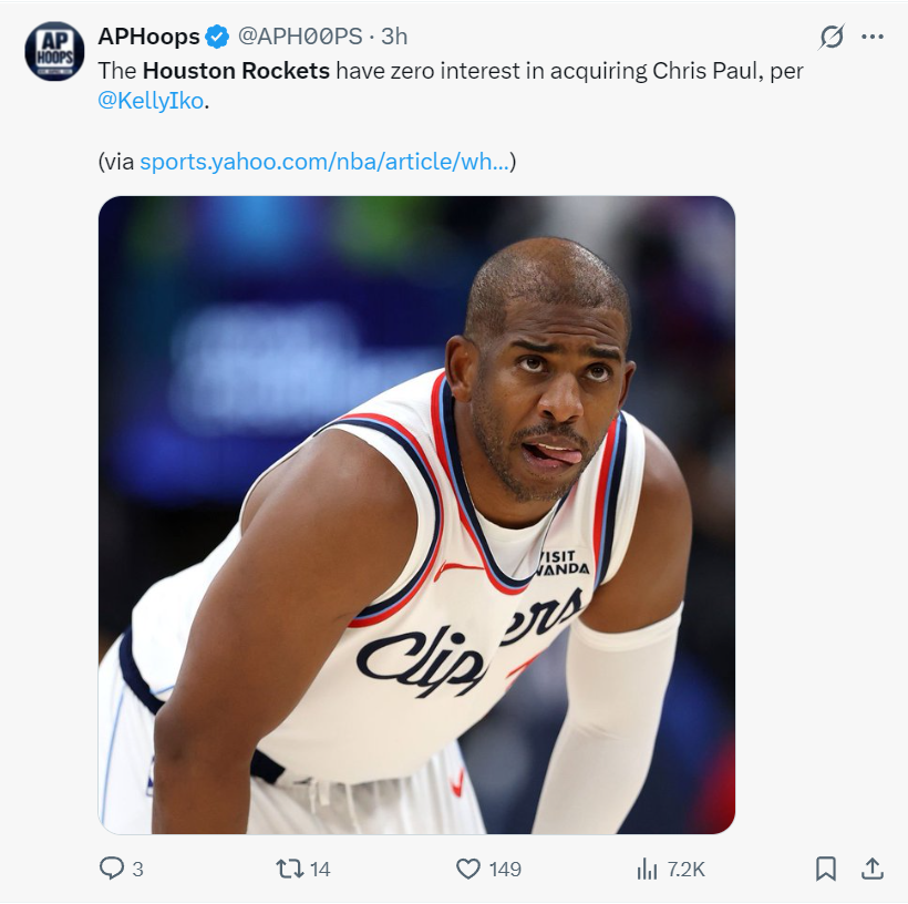 北京时间1月17日,根据《雅虎体育》记者凯利-伊科的报道,休斯顿火箭队对交易得到克里斯-保罗毫无兴趣。一天之前NBA名宿韦德建议火箭交易得到保罗这位组织者,但看起来乌度卡对保罗并不感冒。火箭队近期遭遇了非常大的困局,他们接连不敌开拓者、国王、鹈鹕、独行侠、雷霆等球队战绩已经下滑到23胜15负跌至西部第六,西部第八的勇士距离火箭都只剩下2个胜场,球队没有PG的...