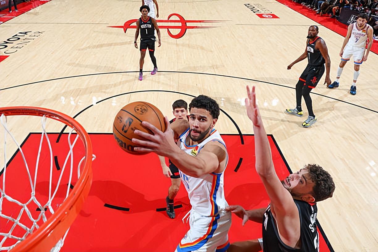 本场比赛中,雷霆的替补后场新星阿杰-米切尔(Ajay Mitchell)的表现令人大跌眼镜。米切尔全场出场22分56秒,投篮10中7,三分线外4中3,得到了17分5篮板3助攻1抢断1盖帽的数据,还有1次失误,正负值为+9。米切尔在进攻端还是展现出了全面的得分能力,他的持球进攻能力和突破能力都相当不错,他也是展现出了不俗的传球能力和组织能力,他也是具备一定的支配球能力的。米切尔在防守端的表现同样是可圈可点的,同样是展现出了很强的个人防守能力。米切尔在本场比赛中又一次很好地扮演了后场大闸的角色,在场上的效果非常突出。雷霆能够比较顺利地取得这样一场大胜,也和米切尔的出色表现密切相关。