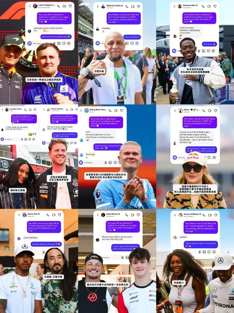 虎扑03月05日讯 北京时间3月5日,在F1澳大利亚站开赛前一天,F1官方发布了9位文体巨星关于新赛季车王的预测。